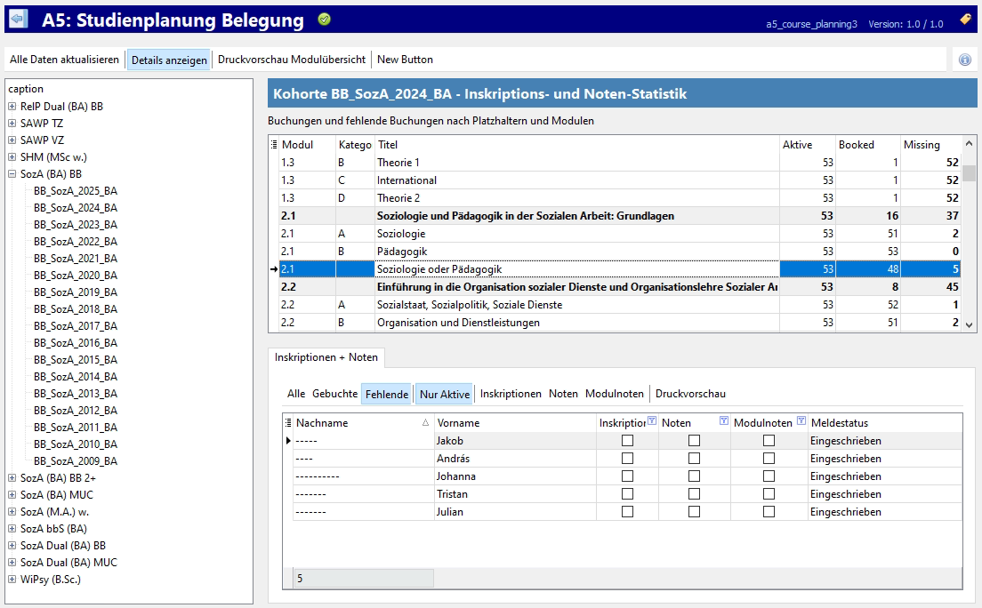 Dabei wird neben der Inskription (Belegung) einer Veranstaltung auch berücksichtigt, wenn anerkannte/abgeschlossene Platzhalter oder gar Module vorhanden sind. Es werden also unter „missing“ nur diejenigen gezählt, die aus der Kohorte wirklich noch einen Platz in einer Veranstaltung für diese Stelle des Curriculums brauchen.